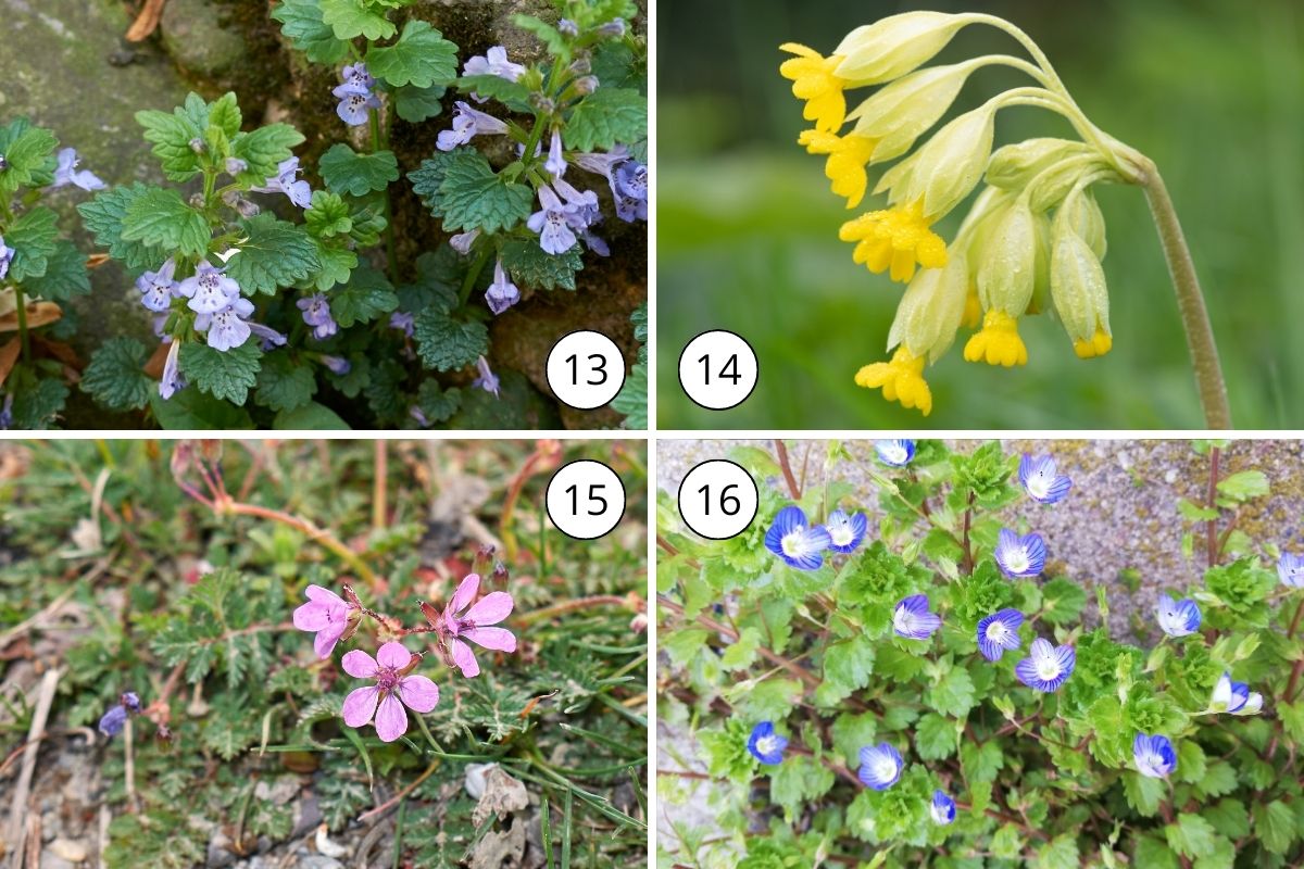 13. popenec obecný (Glechoma hederacea) má drobné fialové květy. Roste na loukách a na okrajích lesů. Jeho květy i listy jsou jedlé.
