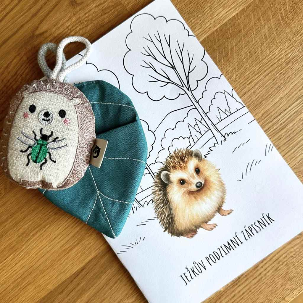 - Zápisník + šitý ježek s pelíškem – ručně šitá figurka ježka a samostatného pelíšku ve tvaru listu vznikla ve spolupráci s úžasnou značkou Lesito, která se specializuje na originální textilní hračky, které mají certifikaci pro děti již od narození. Set je krásně hravý, děti mohou ježka každý večer ukládat ke spánku do listového pelíšku nebo mu vymýšlet vlastní podzimní příběhy. Tuto variantu máme skladem jen v omezeném množství, pokud se vyprodá, je možné tuto variantu objednat na objednávku s dodáním cca do 14 dnů.