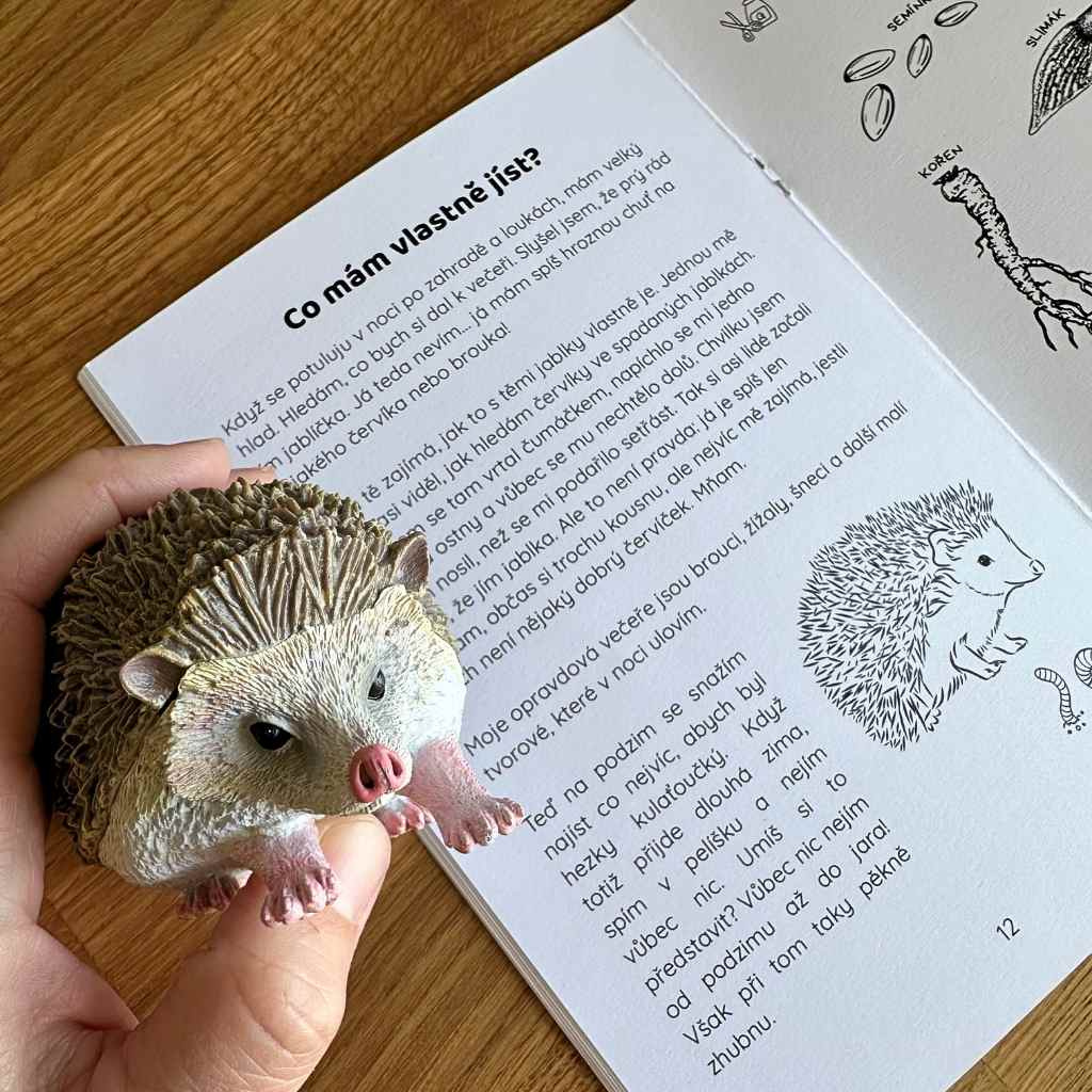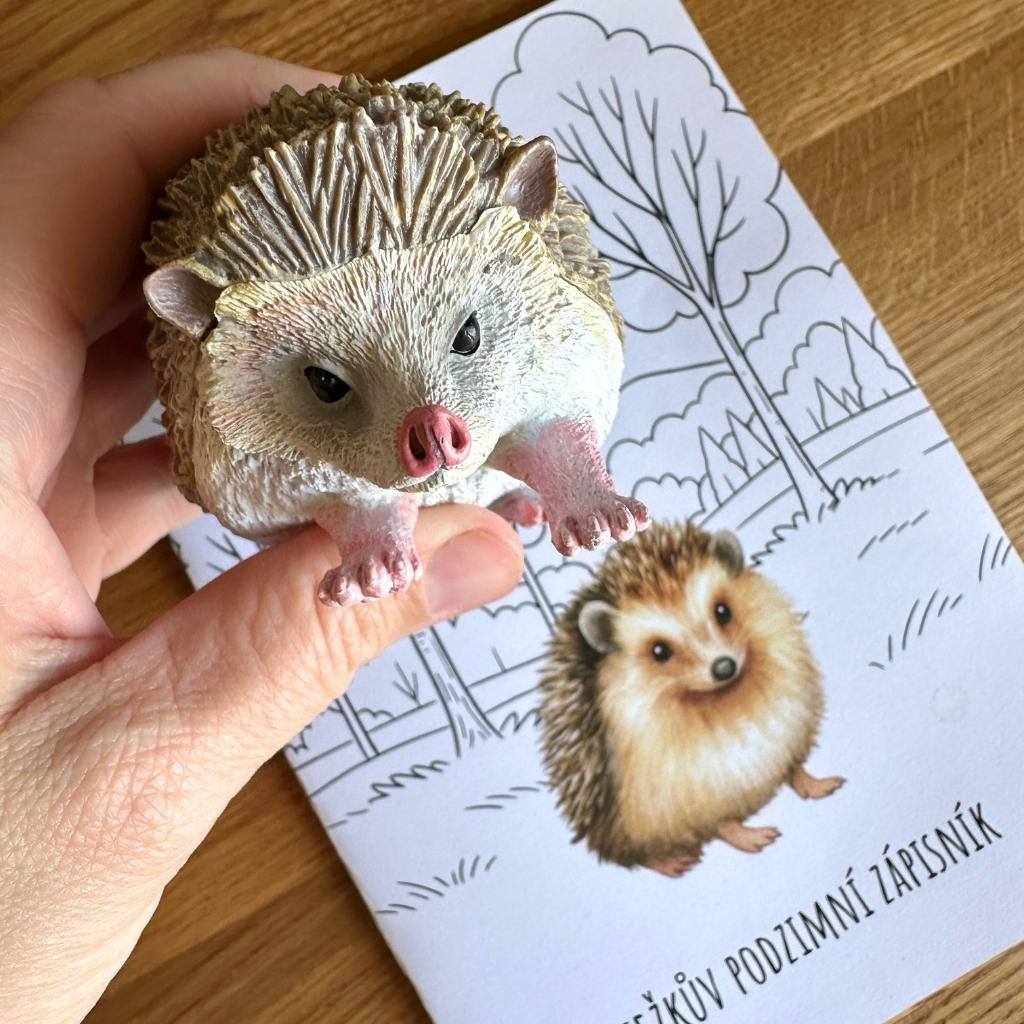 - Zápisník + plastová figurka ježka – figurka od značky Safari Ltd je velmi realistická, věrně zpracovaná a velikostí se vejde tak akorát do dospělé dlaně. Děti mohou mít figurku v ruce, když poslouchají, co ježek zažívá. S figurkou pak můžete dělat různé další aktivity (třeba mu v lese postavit domeček).