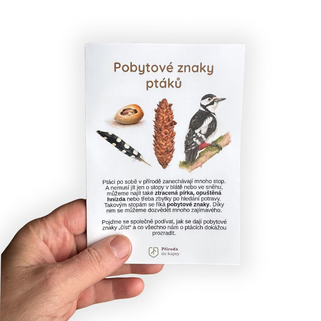 V leporelu najdete základní přehled nejčastějších pobytových znaků ptáků, se kterými se můžete setkat při běžné procházce. Jednotlivé stránky se věnují určování peří vybraných druhů, stopám po hledání potravy, typickým znakům hnízd a také vzhledu běžných ptačích vajíček. Informace jsou zpracované stručně a přehledně tak, aby je bylo možné využít přímo v terénu.