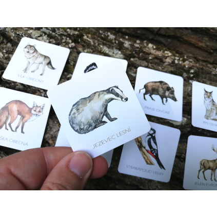 Pexeso s nádhernými ručními ilustracemi zvířat z našich lesů. V pexesu je 16 dvojic, velikost kartiček je 5 x 5 cm.