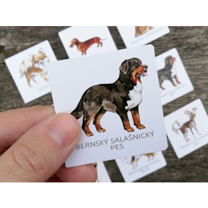 Pexeso s ručně malovanými obrázky různých druhů psů. V pexesu je 16 dvojic, velikost kartiček je 5 x 5 cm.
