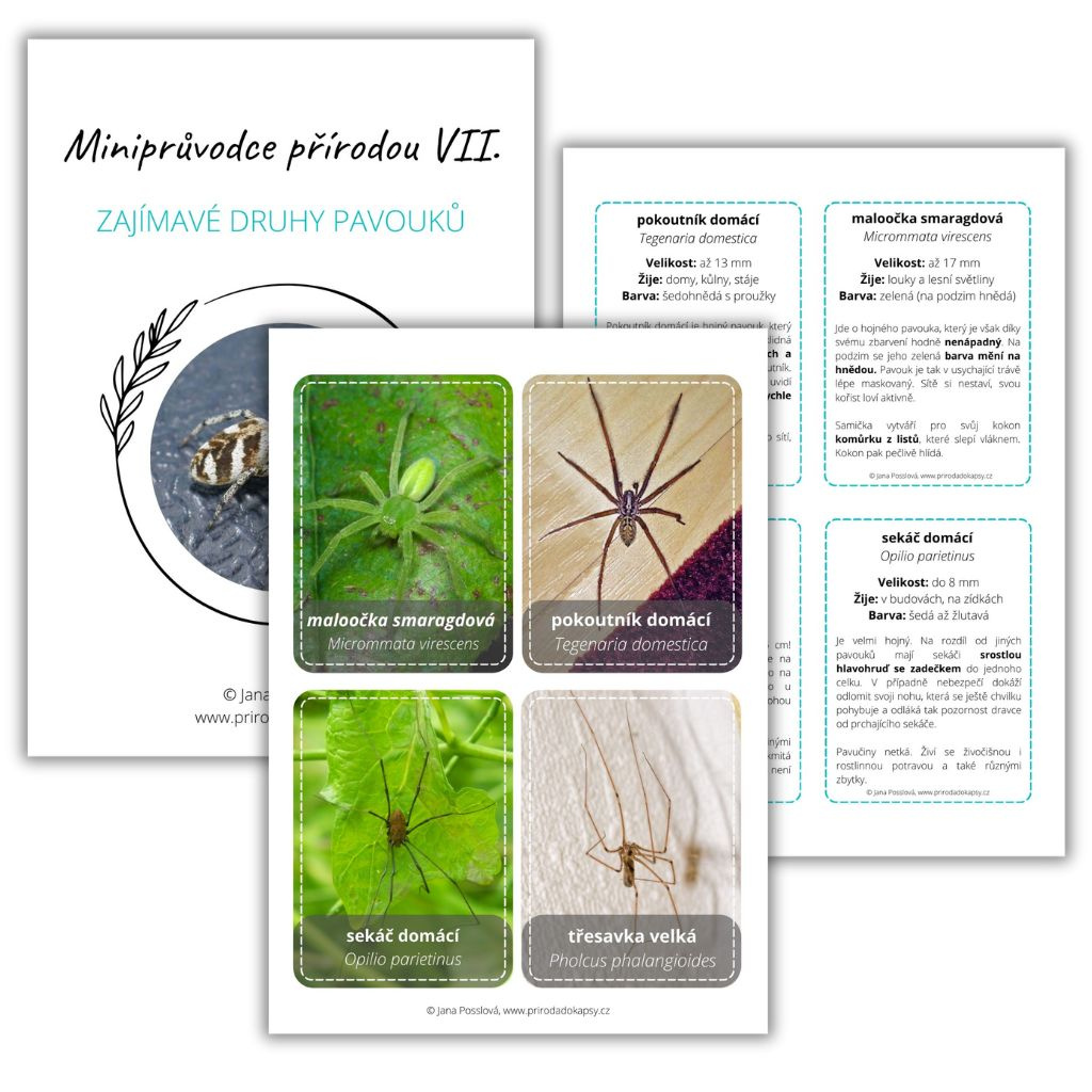 V ČR žije mnoho zajímavých druhů pavouků. Pokud se chcete o pavoucích dozvědět více, nebo se chcete naučit rozpoznat naše nejběžnější druhy pavouků je tento miniprůvodce určen přesně pro vás. Jde o kartičky v PDF, které fungují jako takový mini atlas vybraných druhů pavouků z ČR.