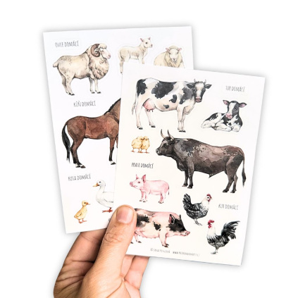 Dva archy papírových samolepek s 17 domácími zvířaty a jejich mláďaty.