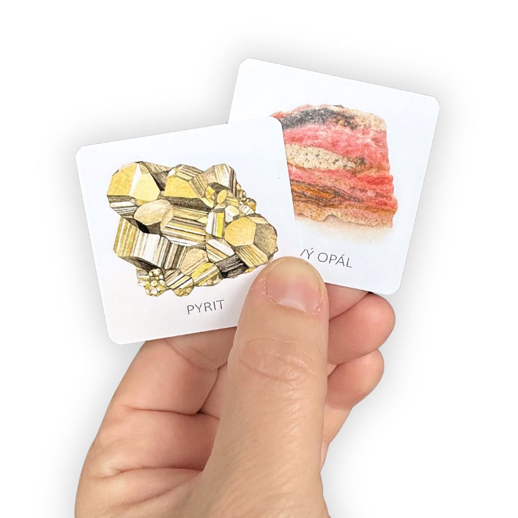 Na kartičkách najdete ručně malované obrázky 16 druhů minerálů – například křišťálu, růženínu, ametystu, pyritu nebo malachitu. Děti se při hraní zabaví, potrénují paměť a přitom se nenápadně naučí poznávat jednotlivé druhy.