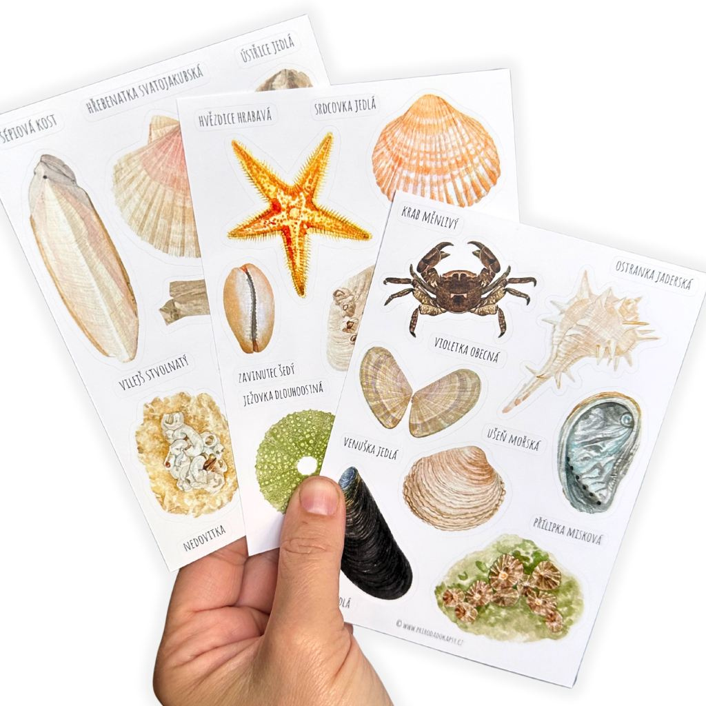 Samolepky jsou skvělým doplňkem pro tvorbu tematických deníčků, přáníček nebo letních vzpomínkových zápisníků. Díky realistickému ztvárnění poslouží i jako výborná výuková pomůcka – třeba při poznávání mořského pobřeží, tvorbě lapbooku o moři nebo při letním projektu o mořských tvorech. Skvěle doplní naše karty Mušle a jiné druhy schránek z pláže.