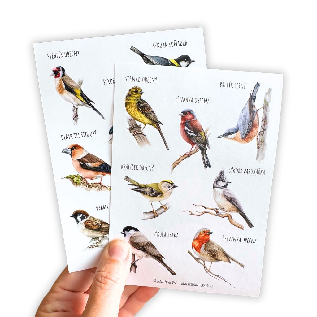 Samolepky naši ptáci obsahují dva archy papírových samolepek s 14 různými druhy našich ptáků. Na arších najdete také 14 samostatných samolepek s jejich názvy, což velmi rozšiřuje využití samolepek. Můžete je tak použít nejen k dekorování (např. diářů, deníčků, fotoalb nebo třeba dárků), ale také k podpoře učení dětí.