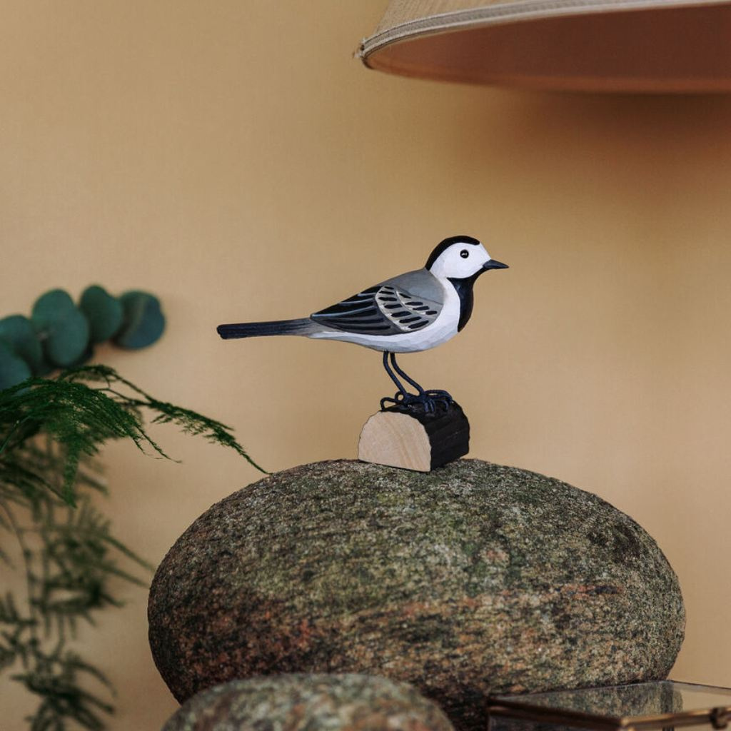 Konipas bílý vynikne zejména v minimalistickém nebo skandinávsky laděném prostoru. Jeho černobílá kresba krásně kontrastuje se světlým dřevem, lněnými textiliemi nebo neutrální stěnou. Zkuste jej umístit na úzkou poličku spolu s několika přírodninami – například oblázky z výletu či sušenými travinami. Vznikne tak jemný, vzdušný detail, který nepůsobí přeplácaně.