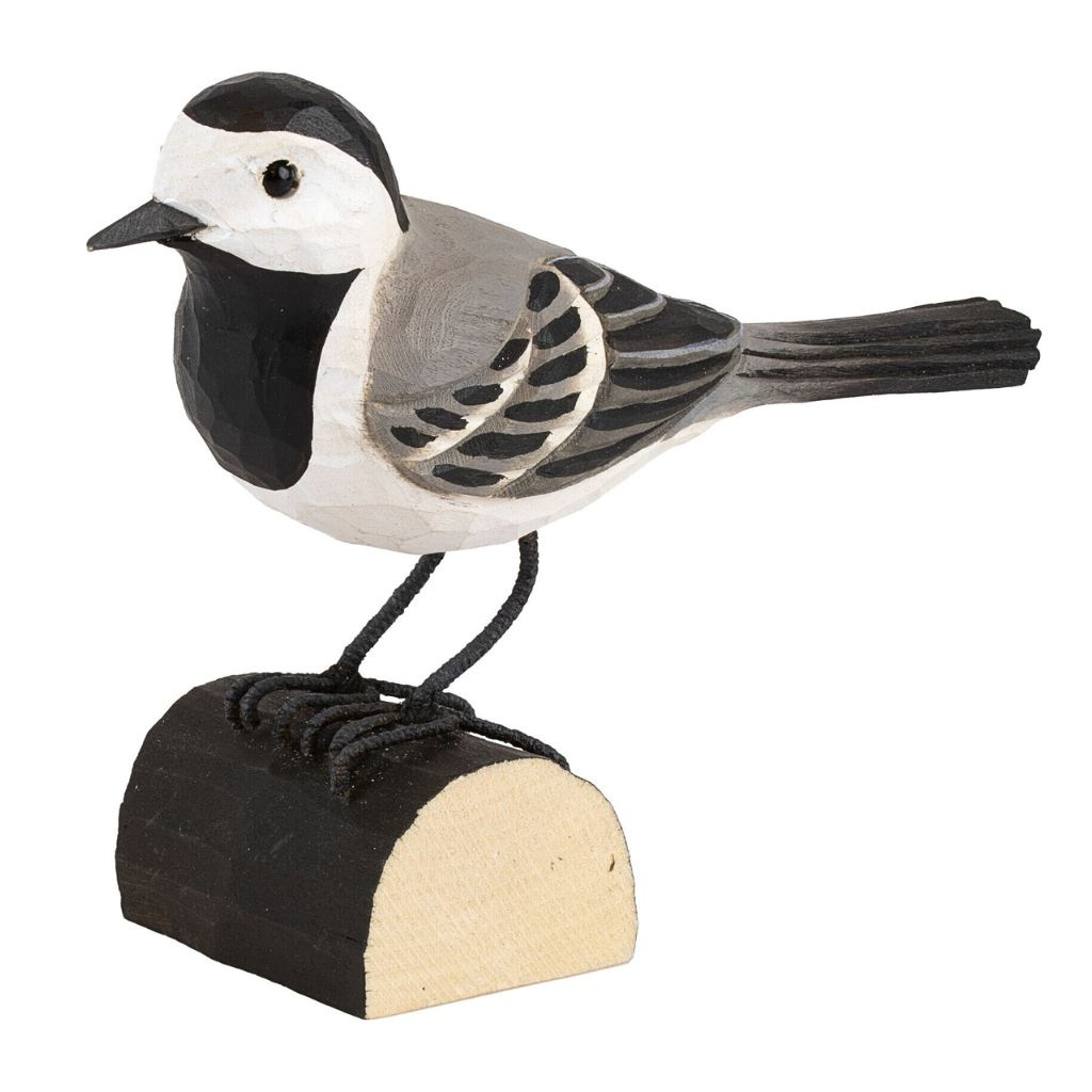 Konipas bílý je štíhlý a elegantní pták, kterého můžeme často zahlédnout, jak při hledání potravy rychle pobíhá po trávnících. Tato dřevěná figurka věrně zachycuje jeho kontrastní černobílé zbarvení i typický postoj. Díky propracovaným detailům působí ptáček velmi přirozeně.