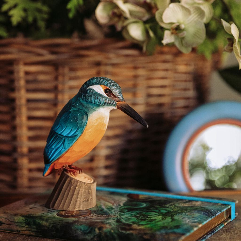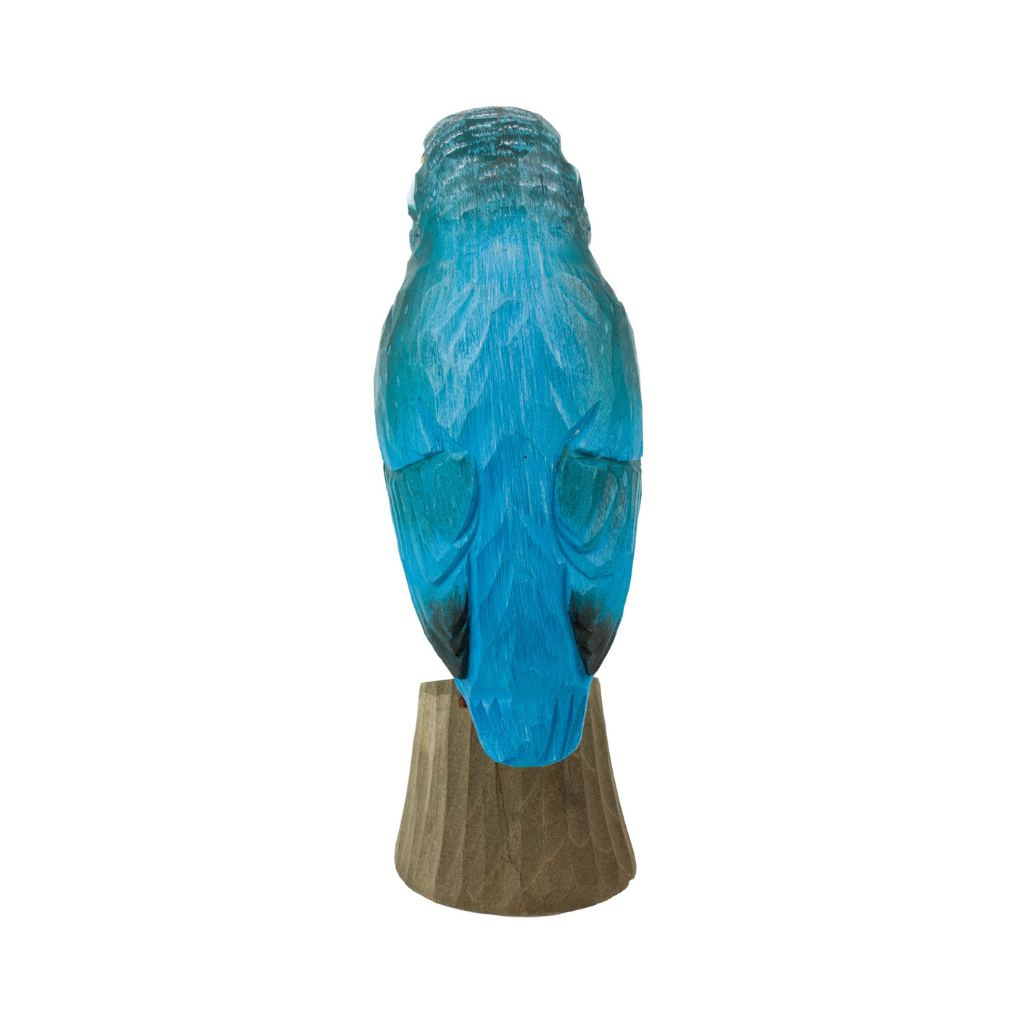 Vyřezávaný ledňáček je krásnou a výraznou dekorací. Díky svému výraznému zbarvení se hodí jako solitérní umělecké dílo vystavené samostatně. Nejlépe totiž vynikne, když se nebude se ztrácet mezi dalšími dekoracemi. Vypadá dobře v tmavé i světlém interiéru. Pěkné je doplnit figurku poblíž nějakým předmětem s modrým akcentem (třeba obrázkem s modrým rámečkem, podobně jak je vidět na fotce). Hodí se i do knihovny, protože pěkně vypadá dohromady s pestrobarevnými hřbety knih.