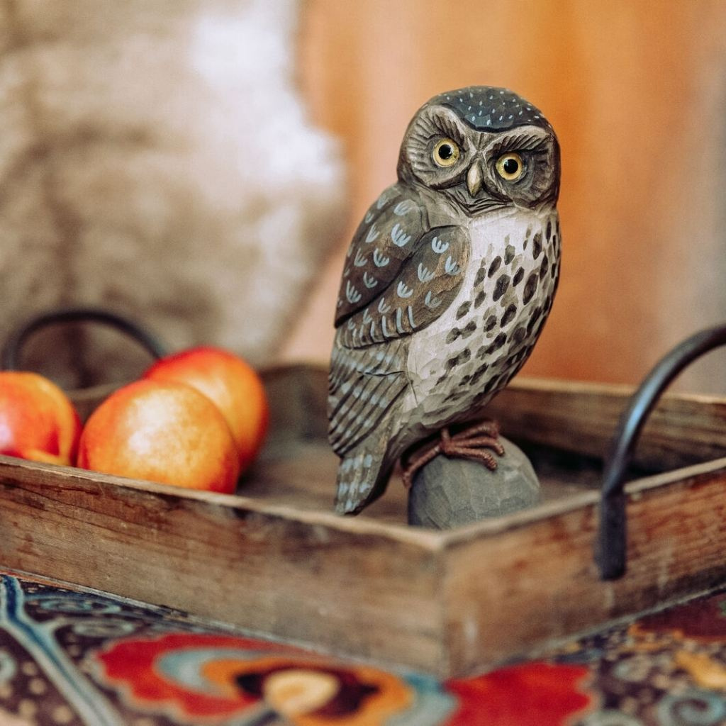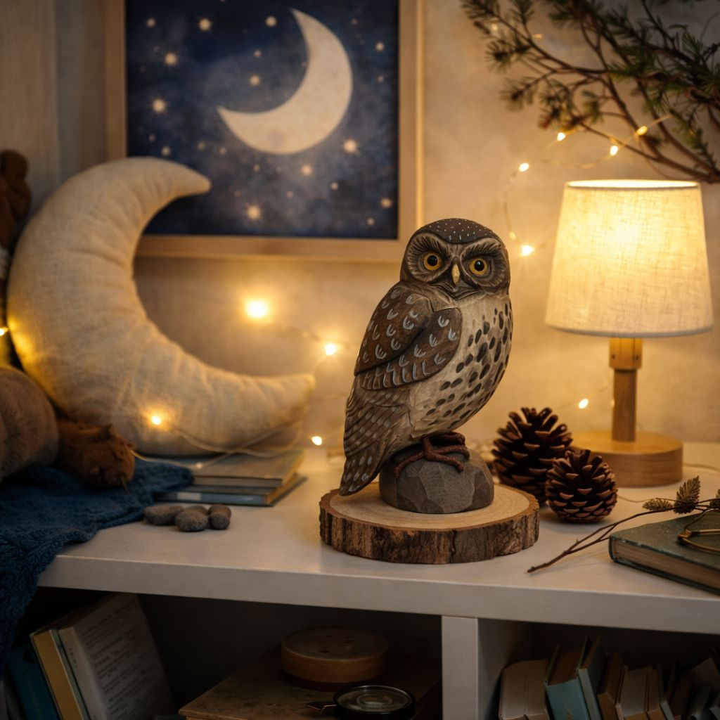 Sýček obecný si přímo říká o místo v klidném, přírodně laděném koutku. Skvěle vynikne na tmavší dřevěné polici nebo v knihovně mezi knihami s přírodní tematikou. Pokud chcete vytvořit harmonický celek, zkombinujte figurku s keramikou v zemitých tónech nebo s menší stolní lampou s teplým světlem. Jemné nasvícení zvýrazní pečlivě vyřezané detaily a dodá prostoru útulnou atmosféru.
