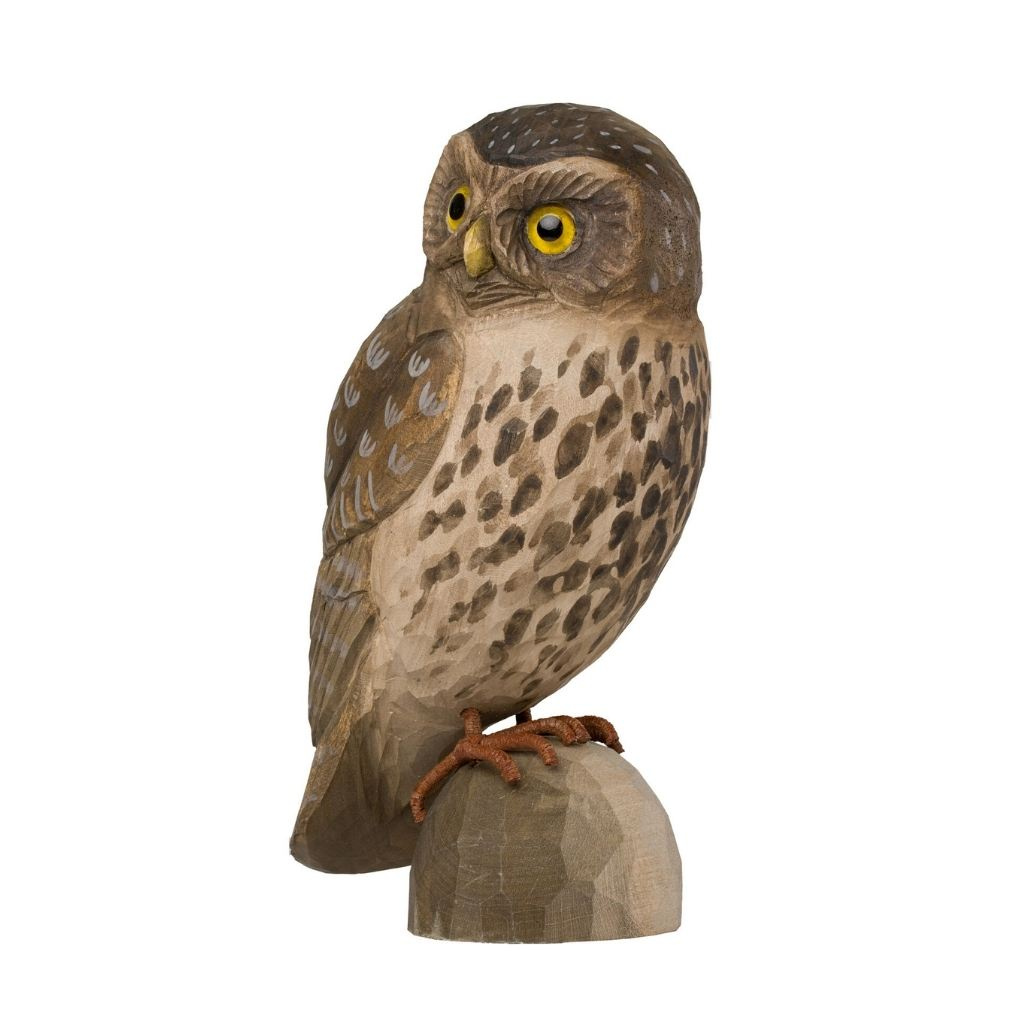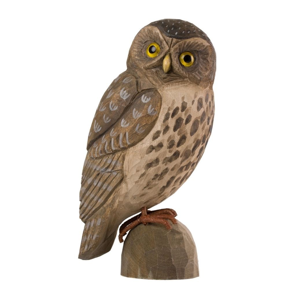Sýček obecný je malá sova s výrazným pohledem a typickou siluetou, kterou si snadno zapamatujete. Tato dřevěná figurka zachycuje jeho typický vzhled – krátký ocas, široce zakulacenou hlavu bez „oušek“ i jemně skvrnitou kresbu peří.