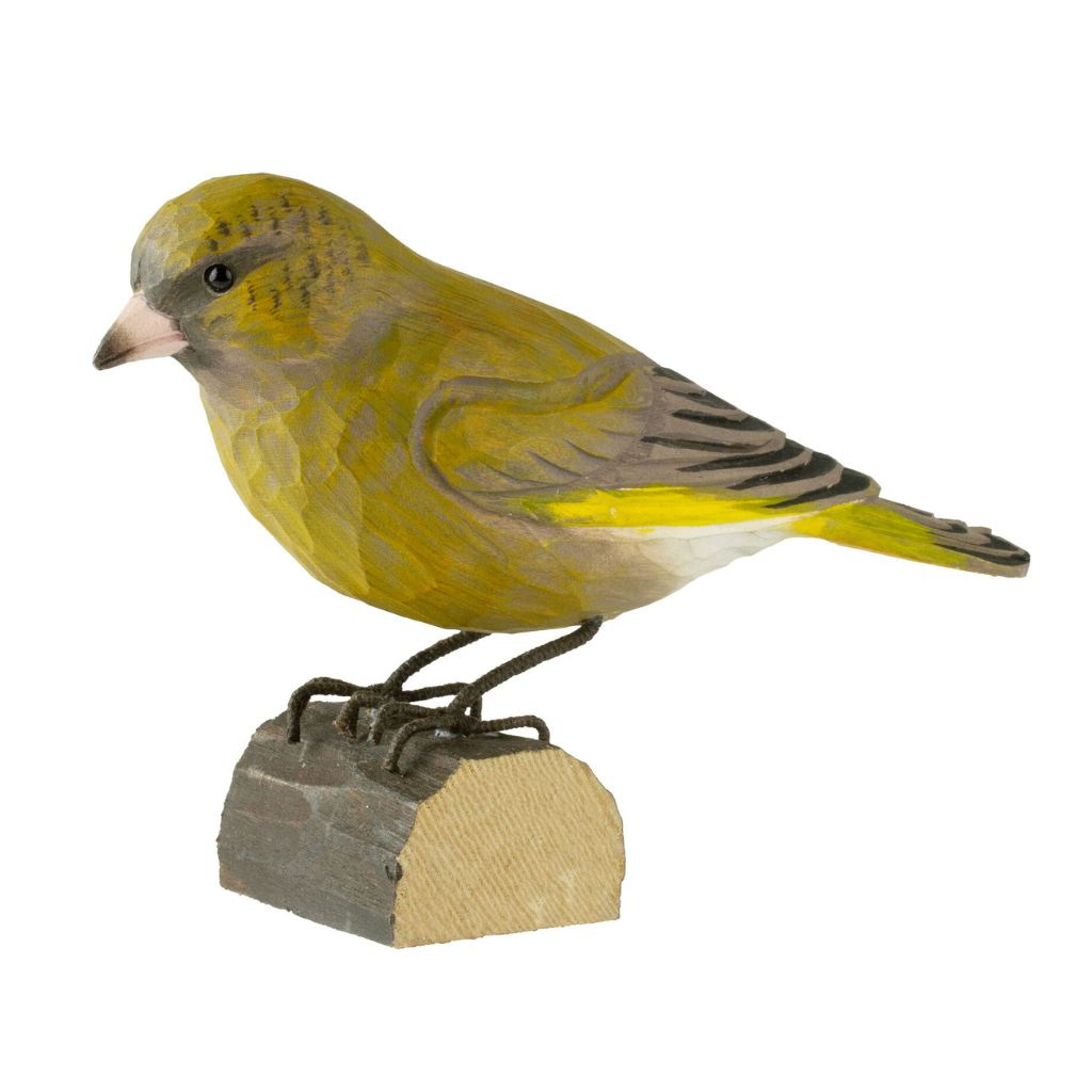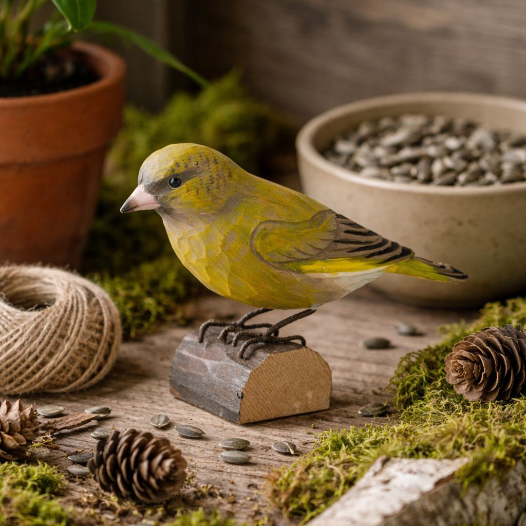 Tento vyřezávaný ptáček věrně zachycuje typický tvar těla zvonka i silnější kuželovitý zobák, kterým louská semena. Ruční malba podtrhuje přirozené odstíny peří, takže figurka působí klidně a realisticky.